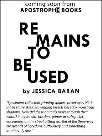 We are pleased to announce the forthcoming publication of Remains To Be Used by Jessica Baran. Like bizarre and often intense conversations, each poem in this collection is ekphrastic. The poet responds to and engages with works by artists, writers, musicians, and filmmakers as diverse as Sergio Leone, Joy Williams, Robert Altman, Raymond Roussel, Lewis Carrol, Robert Gober, Sigmund Freud, Jacques Derrida, Luis Buñuel, Alfred Hitchcock, Gertrude Stein, Hank Williams and many more. . . .