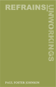 Refrains/Unworkings is Paul Foster Johnson’s first book of poetry. Juxtaposing Romantic ideology against a postmodern disregard for “found” or “authentic” meaning, where “everybody’s ontological investigation/ is guided by anticipated findings,” these poems explore the social space of sound and rhythm and rhetoric. These are love poems, too, paeans so private and so simultaneously public, they evoke a contemporary return to Hart Crane’s White Buildings. Yet, the speaker here resists the totalities of lyric history and their familiar arguments of selfhood: Romantic Man of Taste, revenant noisemaker of the New York School, vatic observer of the Republic, gay poet. Every new utterance is already old—already within limiting quotation marks. Johnson’s clever answer to the problem is a complex recapitulation and revision of lines, phrases, sounds, and images, where even entire movements of a poem are “refrained” but re-contextualized in later poems. Nowhere is this more evocative than in the bookends of Refains/Unworkings. In the first poem, “Rhythmicon,” there is only the voice “without anchor,” a “birdsong of institutional being,” a voice wherein art is without purpose even while the urban bourgeoisie search for new theories of art. In the last poem, “Art of the Cities,” the same sentences of “Rhythmicon” form new lines within the context of polis and socius— post-9/11 New York City— where new construction ultimately leads to monumentally empty glass buildings and memorials to grief, perseverance, and failure.